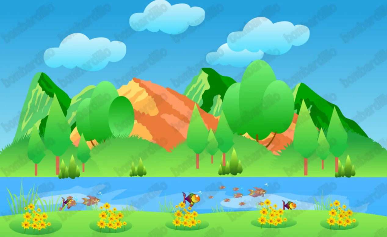 A high-quality, layered background featuring mountains, trees, grass, and a river with fish. All elements are separated into layers for easy customization and parallax effects.